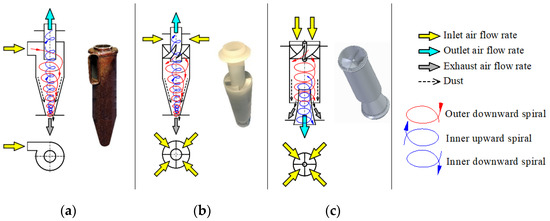 Types of cyclones used for filtering the intake air in motor vehicles: (a) reverse-flow cyclone, (b) return with axial inlet and (c) axial flow (vortex tube separators).