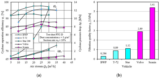 Filtration properties of cyclones as elements of off-road vehicle air filters: (a) characteristics of separation efficiency φc = f(QG) and pressure drop Δpc = f(QG); (b) filtration quality factor.