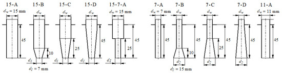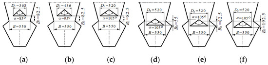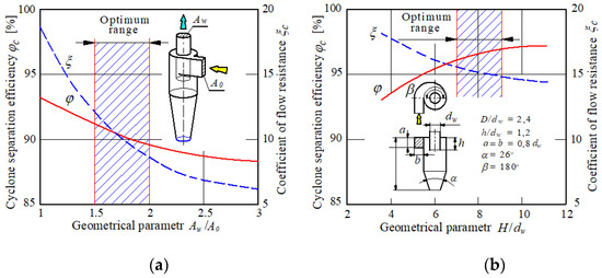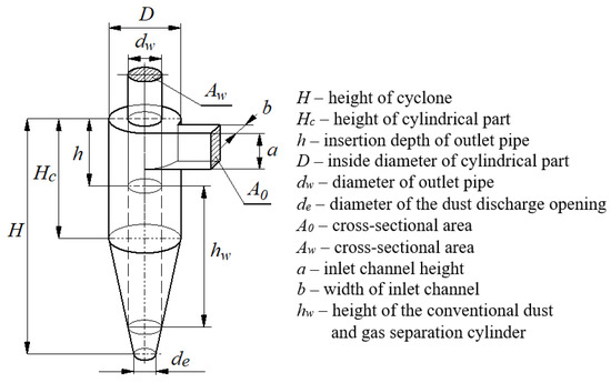 High cyclone operating efficiency, determined by separation efficiency and pressure drop p, is obtained by using appropriate air flow velocities and proportions of its main dimensions, also called geometrical parameters or dimensionless numbers. For tangential inlet reciprocating cyclones, such proportions in the form of quotients of the main dimensions have been established as a result of research work conducted over a number of years [38,39,40,41,42,43,44,45,46,47,48,49,50,51,52,53,54].
