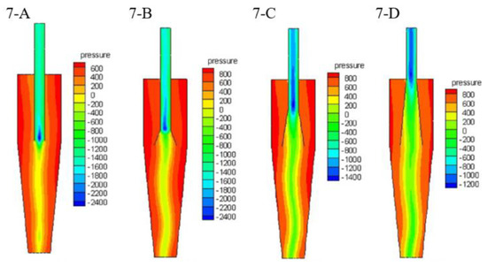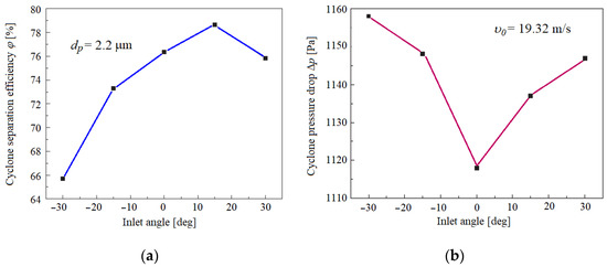 Wang et al. [68] studied the effect of the inlet channel angle of a feedback cyclone on its filtration efficiency. The angular inclination (−30°, −15°, 0°), the downward inlet channel with respect to the horizontal and the upward channel angular inclination (0°, 15°, 30°) were analyzed. It is shown that the inlet channel inclination angle has a direct effect on the gas introduction direction, resulting in changes in pressure drop and filtration efficiency.