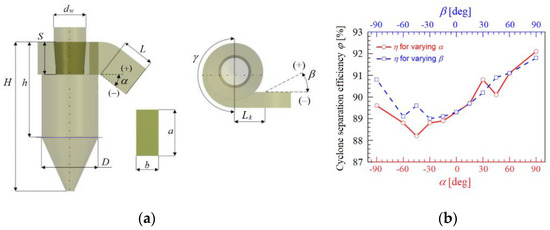 Effect of changing the angle of the cyclone inlet channel: (a) cyclone inlet channel angle in vertical plane α and horizontal plane β; (b) effect of angles α and β on filtration efficiency. Figure made by the author based on data from the paper [69].