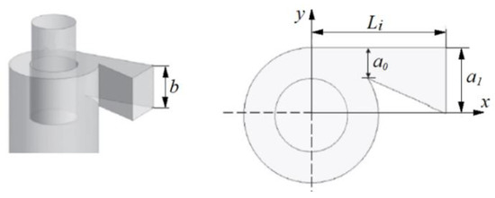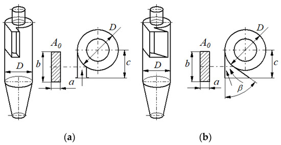 In tangential inlet return cyclones, a single symmetrical inlet with rounded edges in the form of a tube with a rectangular cross-section with sides a and b is commonly used (Figure 1), with the longer side a aligned parallel to the cyclone’s main axis. It has been found that the optimal ratio of inlet width to inlet height b/a is in the range of 0.25–0.5 [53,54], although the authors of [59] report a different range from 0.5 to 0.7