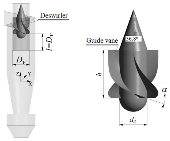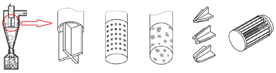 - The cyclone outlet tube (shaping the outlet tube and using special steering wheels (deswirlers) inside the outlet tube) [80,81,82,83,84,85,86];