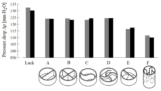 A similar problem was addressed by the authors of [69], who studied the effect of changing the inlet channel angle contained in the vertical plane α and additionally in the horizontal plane β (Figure 9) on the changes in pressure drop and filtration efficiency. The lowest static pressure was recorded in the basic model, and for the other models, the value increased with the increasing channel angle on both sides.