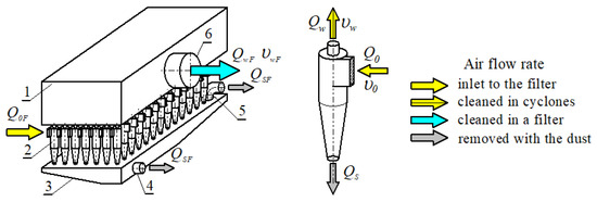 The idea of using two-stage air filters is to initially separate large masses of dust from the polluted air in the multicyclone, without increasing the pressure drop, but with not very high efficiency (87–95%) and accuracy (dp > 15–35 µm), as seen in Figure 2. The remaining small mass of dust is then directed to the filter cartridge made of pleated paper, where the dust grains are retained with high efficiency (above 99.5%) and accuracy (above dp = 2–5 µm) [30,31,32]. As a result, air of the required purity is supplied to the engine cylinders and the operation time of the filtration system is extended, and thus the service interval is extended, which is limited by reaching a certain value of the pressure drop—the permissible resistance Δpfdop.