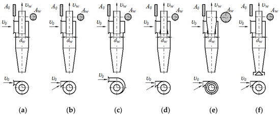 - The cyclone inlet (shaping the inlet tube or changing the way the inlet stream is fed into the cylindrical part of the cyclone) [61,62,63,64,65,66,67,68,69,70,71,72,73,74,75,76,77,78,79];