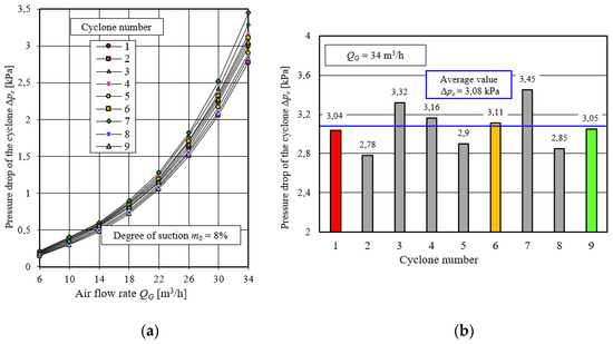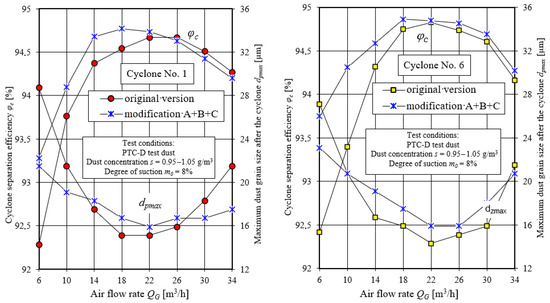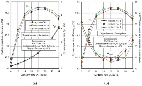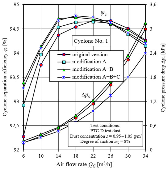 where φ0 is the cyclone filtration efficiency (–) and ∆p is the pressure drop for nominal air stream (kPa).