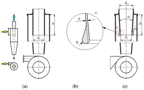 A conventional tangential inlet reciprocating cyclone comprises a cylindrical part, which then tapers downward in the form of a cone terminated by a discharge opening and a dust collector. A tangential inlet is attached to the cylindrical part of the cyclone, which causes the gas containing the dust to swirl, resulting in a spiral motion that first descends along the outer spiral, then ascends through the inner spiral and finally leaves the cyclone through the outlet pipe at the top of the cyclone (Figure 4a). The centrifugal force created by the swirling motion causes the higher mass particulates in the gas to move (overcoming the drag force of the air) toward the outer wall of the cyclone, where they are braked and stopped, and then fall by gravity into the dust container. Gas flowing spirally downwards, due to the shrinking diameter of the circular cone and the attraction of the low-pressure zone in the middle of the cyclone, changes its direction of movement spirally upwards at the bottom of the cone. The gas purified from larger dust grains is discharged from the cyclone through a cylindrical outlet tube located in the upper part of the cyclone. The cylindrical part of the cyclone is connected to the outlet pipe by a tight cover. The cyclone design is simple, but the gas flow inside is a complex three-dimensional vortex flow [35].