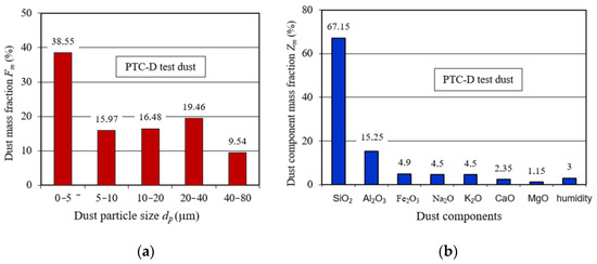 Due to their low velocity of descent, dust grains with a size of dp = 2–10 µm remain in the air for a long time and are sucked in together with the intake air to the engine cylinders. On the other hand, airborne dust grains with a size of dp = 10–50 µm are sucked in with the engine intake air when the vehicle is operated in conditions of high dust concentration in the air. In raised dust clouds, dust grains with diameters not exceeding dp = 50–80 µm account for 80–100% of the total dust mass. Dust grains larger than 50 µm are found in the air during the use of vehicles on training grounds, in quarries, on construction sites and during take-off or landing of a helicopter on an adventure landing pad [7].