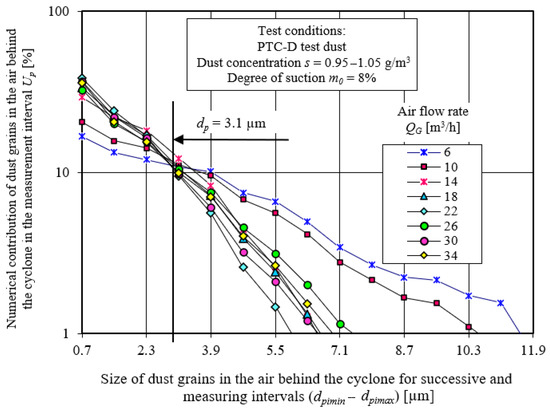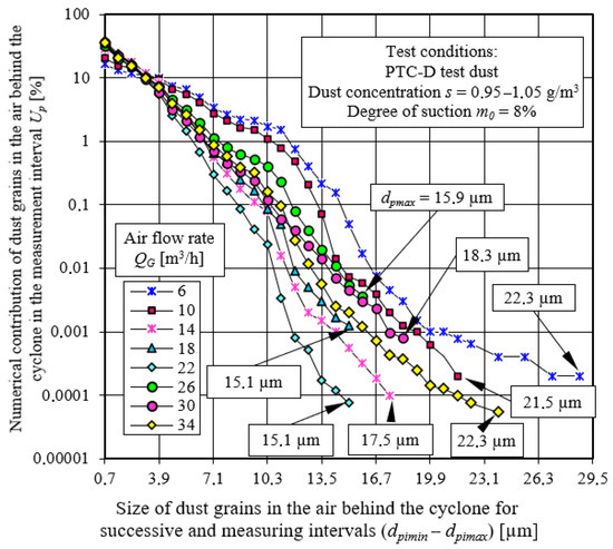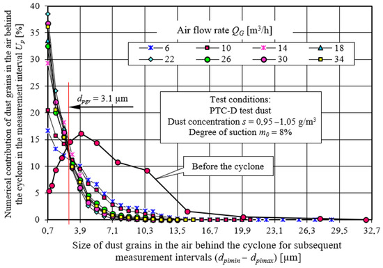 The range of inlet velocities 0, within the limits of which the changes in the purification efficiency are relatively small, should be as large as possible because it makes it possible to use the best separating capabilities of the cyclone at a widely varying air stream QG as a result of changes in the engine rotational speed n. The range of inlet velocities 0 is at the level of υ0 = 12–20 m/s, and exceptionally reaches the value of 25 m/s [56,57,58,59]. The use of high velocities generates high pressure drop. According to the study of the author of [60], the cyclone inlet velocity reaches υ0 = 35 m/s, but the pressure drop also reaches a large (about 4 kPa) value.