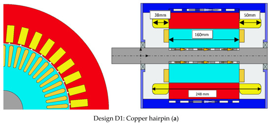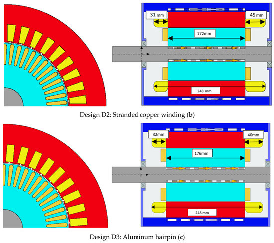 Figure 2 shows the radial and axial cross-sections of the initial design D1 with a copper hairpin, design D2 with a stranded copper winding, and design D3 with an aluminum hairpin winding.