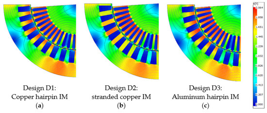 The flux densities of the three proposed designs are reported in Figure 3 for verification that each design reaches a similar level of material saturation.