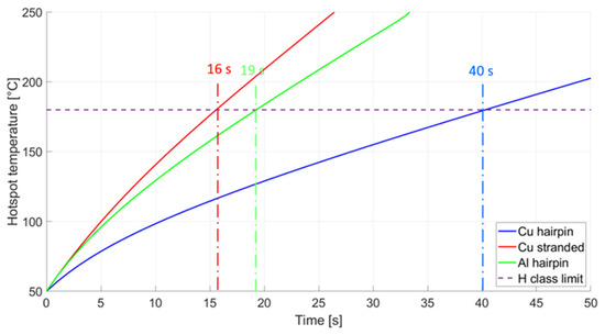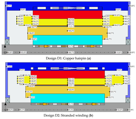In all three designs, the temperature is kept below the critical level for the considered insulation class. Concerning the hotspot temperature, it is interesting to note that D3 passes from an initial situation of a slight disadvantage to a slight advantage at the end of the drive cycle; this effect is due to the higher specific heat of aluminium compared to copper.