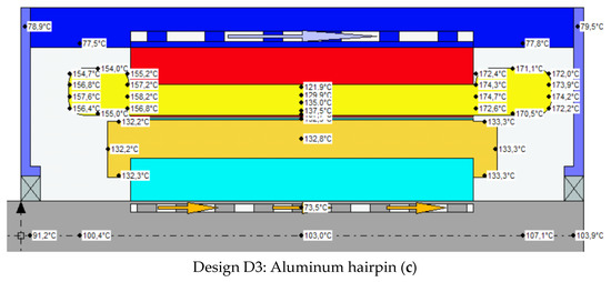 Steady-state temperature at rated power and ambient temperature of 50 °C for the same cooling system: (a) design D1; (b) design D2; (c) design D3.