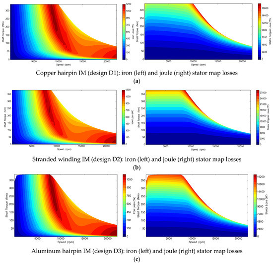 The different loss contributions and the efficiency levels of the three designs are evaluated here in the operating range. The map is drawn considering the maximum torque per ampere control strategy (MTPA) and an appropriate field weakening strategy, where the voltage is a limitation up to a maximum speed of 22,000 rpm. The considered maximum current is the rated current (500 ) and the DC bus voltage is 800 V with a maximum modulation index of 0.98 [35].