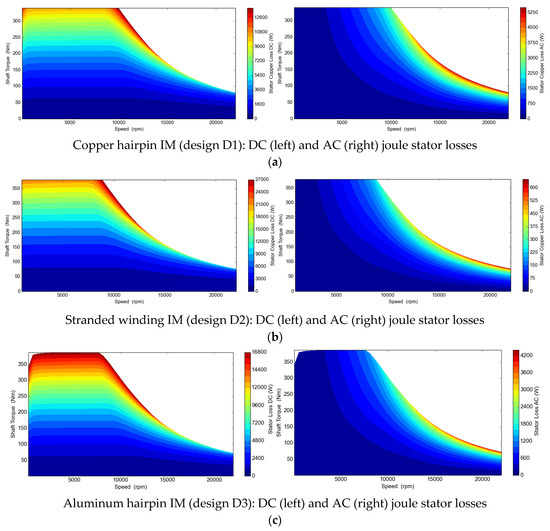 The total losses are strongly affected by the winding losses, as confirmed by the values reported in Figure 6. While the losses in the iron remain largely constant for the three cases, the joule losses in the windings strongly depend on the choice of winding technology used. In this regard, the losses in the stator windings are further explored and discussed in the maps in Figure 7, which detail DC and AC losses.