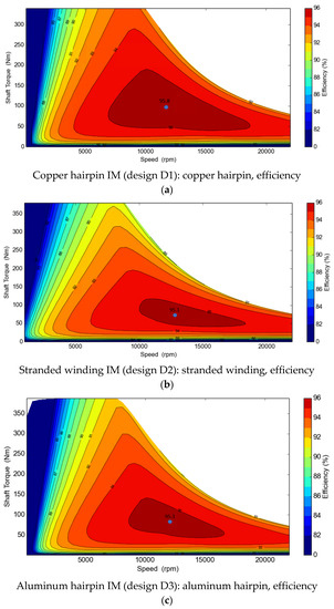 In order to evaluate how these losses affect the motor efficiency, the efficiency maps are reported in Figure 8 for the operating torque and speed characteristics.
