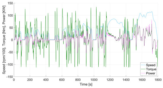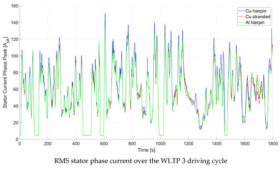 The aim of this section is to evaluate the performance of the three designs by considering a reference drive cycle and comparing the results for the different winding technologies. Indeed, in the driving cycle, the motor may operate with different torque and speed values, which for much of the time are even lower than the rated ones. The WLTP class 3 driving cycle is selected to evaluate the performances of the three proposed designs, considering the target vehicle mass of 2500 , frontal area of 2.35 , and gear ratio of 11.62 (wheel radius of 0.35 ). The torque, speed, and power required by the driving cycle are reported in Figure 9.
