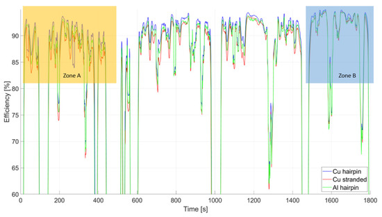 In detail, two zones are highlighted in Figure 10 to focus on how the driving speed affects the efficiency. In zone A, where the speed required is lower, the differences between the efficiencies of the three projects are more evident, while at high speed this difference decreases. This is justified by looking at the previously reported efficiency maps, which in the higher speed zone are more similar than at low speeds.