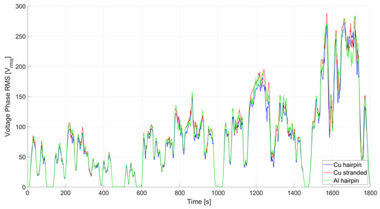 The efficiency, RMS stator phase current, and RMS stator phase voltage are shown in Figure 10 and Figure 11 for the different winding technologies.