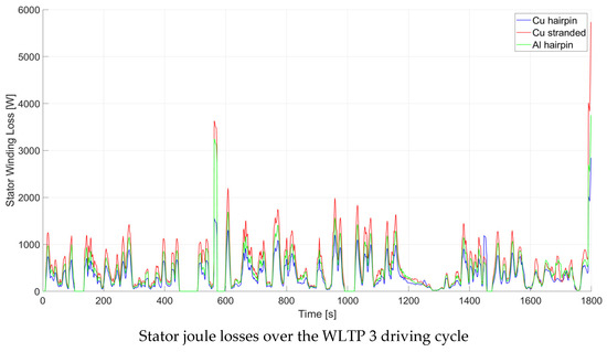 It can be noticed that the average energy efficiency is influenced in a relevant way by the winding technologies. As expected, design D1 has the best energy efficiency with a value of 93.05%, while the energy efficiency of design D3 is higher than that of design D2 (by about 1%). Indeed, the main differences among the three designs are related to the stator windings losses (D2 at +76% and D3 at +43% with respect to D1). The analyses on the WLTP driving cycle confirm the higher efficiency of the copper hairpin windings, while the aluminum hairpin windings seem to have efficiency benefits compared with stranded wires.