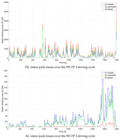 The total losses in the stator windings are shown in Figure 12. In particular, to better investigate the joule losses, they are again detailed for DC and AC components.