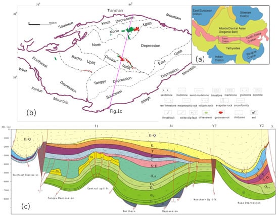 (a) The tectonic location of the Tarim Craton, (b) the tectonic unit division and the oil/gas accumulation in the Cambrian–Ordovician carbonates, and (c) geological section across the Tarim Basin (revised after reference [22]).