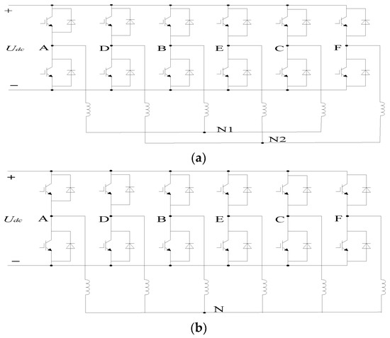 Neutral line connection mode of DTP-PMSM drive system. (a) Structure 1. (b) Structure 2.