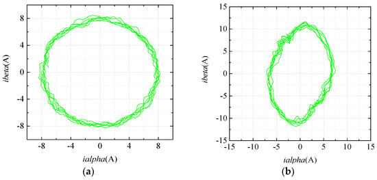 Figure 4a shows the current trajectory curve in α-β subspace. It is approximately circular when the motor operates healthily, which is consistent with (10). In the open circuit fault state, the current trajectory is no longer circular, as shown in Figure 4b.