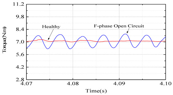 Figure 6 shows the torque waveform of a motor without a fault and with an F-phase open circuit. The motor rated torque is 7.1 Nm. It can be seen that motor torque ripple is obvious with an open circuit fault, which will produce a lot of noise.