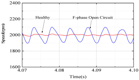 Figure 7 shows the speed waveform of the motor in healthy operation and F-phase open circuit operation. It can be seen that motor speed is stable at the given speed when there is no fault. While the speed fluctuates greatly with an open circuit fault, it cannot run smoothly.