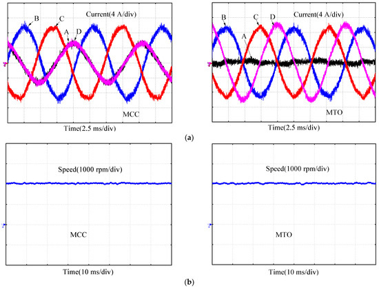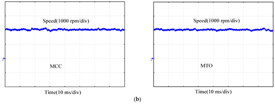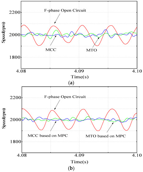 Figure 8 shows the speed of the motor in open circuit fault and fault-tolerant operation. It can be seen that motor has large speed oscillation and poor speed regulation performance in open circuit fault, and the speed ripple is as high as 10%. The speed ripple is smaller with the proposed MCC and MTO than that with traditional MCC and MTO. The motor speed ripple is reduced to 2.3% with the control strategy of the proposed MCC based on MPC. The motor speed ripple is reduced to 2.5% with the control strategy of the proposed MTO based on MPC.