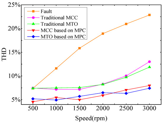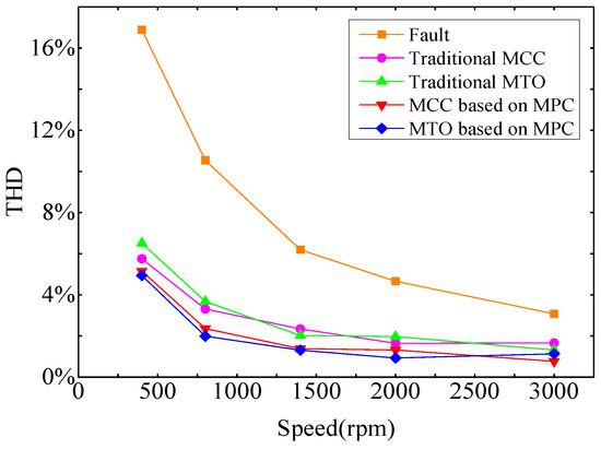 Figure 9 shows the speed THD of the motor at different speeds without fault tolerance, traditional MCC and MTO with fault tolerance, and the MCC and MTO with fault tolerance based on MPC proposed in this paper. THD is significantly lower with fault-tolerant control than that without fault-tolerant control. Moreover, compared with the traditional MCC and MTO, the THD weakening effect is better with the proposed MCC and MTO.