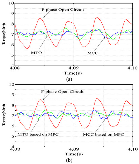 Torque in fault operation and fault-tolerant operation. (a) Fault-tolerant control with traditional MCC and MTO. (b) Fault-tolerant control with proposed MCC and MTO.