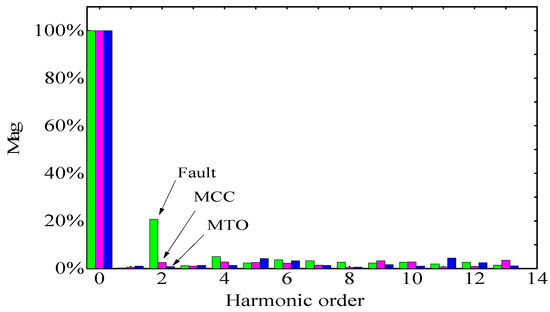 Figure 10 shows the torque waveform comparison between open circuit fault operation and fault-tolerant operation. It can be seen that the torque ripple is obvious without fault-tolerant control, which will produce large noise. However, the torque fluctuation is basically stable and small with the two fault-tolerant controls. The THD analysis of torque with fault operation and two fault-tolerant control strategies is shown in Figure 11. The result shows that the THD of the torque weakening effect is better with the proposed MCC and MTO than that with the traditional method. Then, the harmonic analysis of the torque with the proposed fault-tolerant control method is carried out as shown in Figure 12. The result shows that the second harmonic components of the torque in fault operation is very high, and is significantly reduced through the proposed fault-tolerant control. This is consistent with the analysis in Section 5.