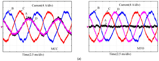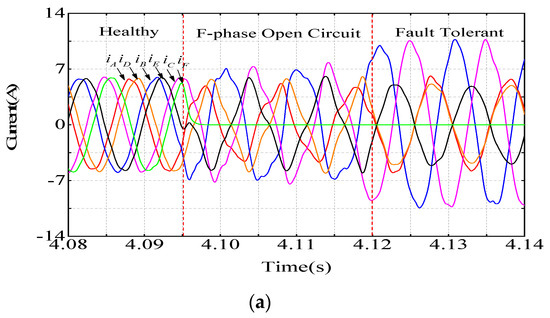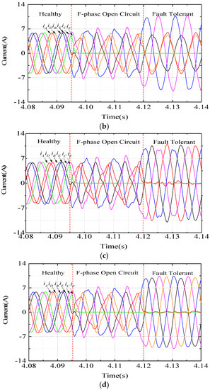 Figure 13 shows the current during the healthy operating, F-phase open circuit and fault-tolerant control state. The amplitude and phase of the remaining phase current can be reasonably arranged through fault-tolerant control. It can be seen from the figure that the distortion of the current waveform is small when the proposed MCC and MPC methods are adopted.