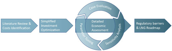 The first step of the methodology involves the literature review and market research required to identify representative costs and trends that will lead to reliable results. In the next step, a preliminary investment optimization is formulated as a linear optimization problem to gain an initial cost-effective estimate for the SOFC sizing along with grid operation data. This information is used as an input for step 3, where the detailed economic assessment takes place. Furthermore, a sensitivity analysis procedure is performed to study the behavior of the system under uncertain parameter changes. Finally, a review of the specific regulatory barriers is presented, and the LNG roadmap is drawn.