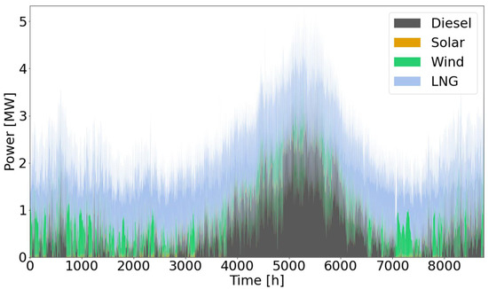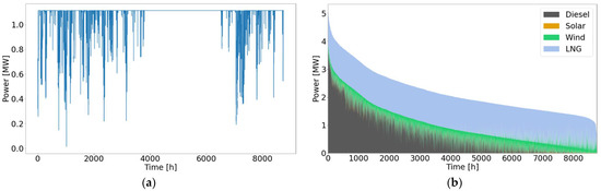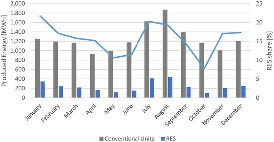 Figure 3 presents the energy mix of the island on a monthly basis for the year 2020. On average, a 16.2% RES penetration is achieved due to the high wind and solar resources of the Aegean Sea. Due to this low penetration level, the curtailment events because of excess of electricity from RES are insignificant and thus are neglected in this study. Moreover, since there is no actual plan for further installation of RES on the island, it would be meaningless to investigate excess power exploitation or energy storage unit installation in the near future.