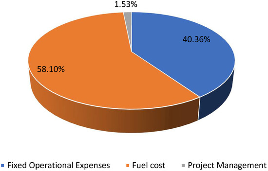 The operational expenditures (OPEX) value represents the sum of all expenses during the operation of the system. A breakdown of the categories of expenses included in the OPEX can be seen in Figure 4. It includes the annual operating costs and the total costs of the restacking procedure that takes place approximately every 9 years. Besides fixed OPEX, fuel costs and expenses for project management are also included [23,24]. Further to this, the annual expenses for the insurance that equal to 3% of the capital expenditures (CAPEX) have been included, which account for the estimated cost of insuring the facility.