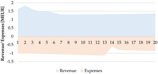 The term debt describes the CAPEX percentage that has been funded through loans and the interest rate represents the financing rate provided by the bank or any other debt investor. In this investment, a typical interest rate of 5% is considered [22]. In Table 7 the assumed sources of funding are presented. Such investments are also often funded through financial support from the government to promote financial, social, and environmental policies. To decrease the cost and to produce systems with lower power capacities, governments and states establish funding programs to promote these sustainable technologies and facilitate their transition from the research and development stage toward early market adoption. Japan and Europe are taking the lead in providing and supporting applications for FC-based micro-cogeneration units [27]. The percentage of state subsidies will be assumed to be zero in the initial assessment; however, scenarios with an increasing percentage of state subsidies will be studied for the sensitivity analysis. Since the project is a taxable entity, all the tax-related cash flows are treated with an addition of 24% tax, which was the Greek corporate tax rate in 2020. Although in 2021 the tax rate was reduced to 22% [31], the former value of 24% was considered in the present analysis in order to be on the safe side.