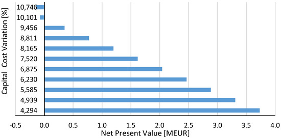 The net present value (NPV) is used as a metric for long-term analysis of the viability of an investment. It calculates the difference between the present value of all costs and of all revenues with reference to a single date, for the rate of return on the project in which investment is made and calculated before implementing a system. A positive resulting value means that the implementation of the SOFC system is profitable; otherwise, its integration would lead to an economic loss. The higher the value of a positive NPV, the more profit the project will produce [17].