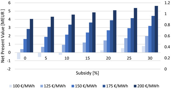 In this analysis, the legislation of Greece has been taken into consideration and technoeconomic scenarios with and without state subsidies have been studied. A subsidy amount starting from 0% and reaching 30% is assumed, and the results are presented in Figure 10.