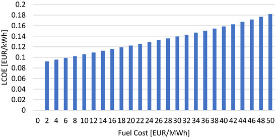For a high fuel cost of 50 EUR/MWh, the LCOE can reach 0.18 EUR/kWh. Meanwhile, if the fuel cost drops to 2 EUR/MWh, the LCOE would reach much lower values of 0.09 EUR/kWh.