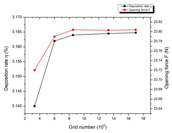 Due to periodic position of spiral grooves, one single period section of the lubrication film is calculated. For when it is at 3000 rpm and the medium pressure is at 0.2 MPa, the deposition ratio and opening force computation results, with various grids, are presented in Figure 3. While grid quantities go beyond 590,000, the computation results are barely variational to the grid number. After overall consideration, we chose a grid number of 590,000. The grid generation is illustrated in Figure 4.