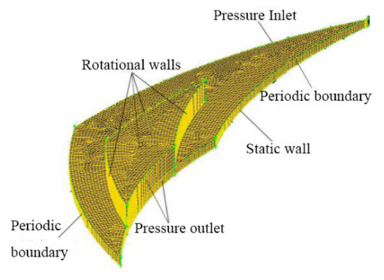 The boundary condition settings are shown in Figure 4. The lubricating film in the spiral groove is set as the rotating water body. The none groove zone is set as the static water body. The rotational ring surface, the axial three side walls of the spiral groove, and the bottom surface of the groove are all arranged as the rotating moving wall surface. The static ring surface is set as the static wall surface. The inlet pressure is set at 0.2 MPa, the outlet pressure is equal to the atmospheric pressure, and the rotational speed ranges from 1000 to 5000 rpm.