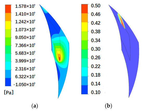 Calculation results of continuous phase flow field. (a) Film pressure distribution; (b) Volume fraction distribution of gas phase.