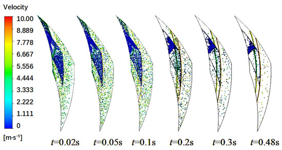 Time starts at the moment when the first particle enters the lubrication film; the particle-releasing period is 0~0.1 s. Figure 7 shows the position and velocity of particles in the lubrication film at different times. A vast number of solid particles are sucked inside the low-pressure zone caused by the spiral groove pumping effects and leeward step diffusion effect. The particles that are sucked from the groove are blocked by the groove side wall and dragged by the pressure gradient on outer groove root, so their velocity stays low. Some particles in the low-pressure zone rest on the outer boundary and leeward side, and others acquire shear power and then proceed to the high-pressure zone inside the grooves or dam region. Those who are sucked from the weir area gain relatively higher velocity, owing to the circumferential flow, then they flow to the dam region under the impact of centrifugal force. Those who reach dam region escape from outer radius side of the lubrication film thrusted by centrifugal force and pressure gradient pointed to outer diameter side of the lubrication film. After particles are completely released (after 0.1 s), the both particles escape of the inner and outer diameter continues, number of particles inside the lubrication film is diminishing, especially those near inner diameter side. Meanwhile, circumferentially distributed particles appear on the cavitation boundary and outer groove root, which proves that radical force is balanced under certain conditions, so the particles perform purely circular motion in certain positions. Particles distribution and deposition quantities are almost stable till it comes to 0.48 s, only few particles stay at outer boundary of low-pressure zone inside the groove, near leeward side, on the outer boundary of cavitation and in the circular zone on the outer groove root. For studying particles deposition characteristics in the lubrication film, we define the ratio of the number of residual particles in the lubrication film to the number of particles sucked from the inner diameter side as solid particles deposition ratio.