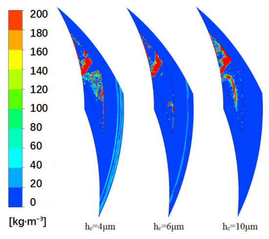 As can be seen in Figure 8, the particle deposition inside the grooves is distinct and it extends from the low-pressure zone to outer groove root. Especially when the groove depth is lower, the hydrodynamic effect is relatively weaker. Thus, the film pressure on the outer groove root side is relatively low, and the circumferential particle deposition belt generates because of the reducing pressure gradient in the dam region. With the groove depth increasing, the circumferential deposition belt shrinks and ultimately vanishes, thus making the groove zone become the main deposition region.