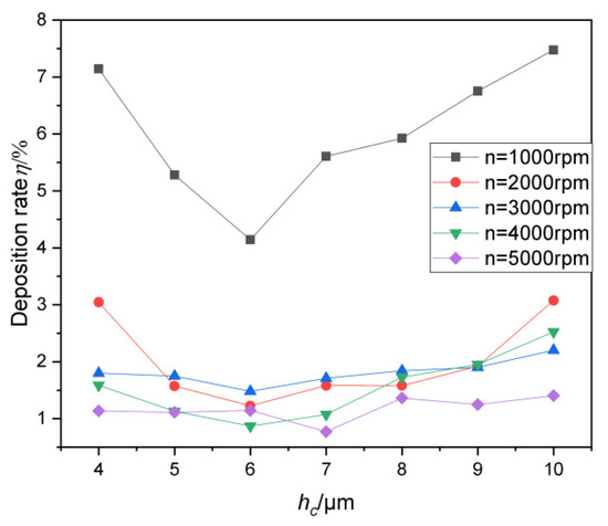 It can be seen from Figure 9 that the particle deposition rate first decreases and then increases with the increase of the groove depth. The optimal depth of the groove is about 6 µm. On the whole, the deposition rate decreases when the rotational speed increases. When the rotational speed is lower than 2000 rpm, the influence of the groove depth on the deposition rate is obvious, and the influence is weak when the rotational speed is higher than 3000 rpm. This shows that, with the increase of the rotational speed, the high-speed cause pumping effect and dynamic pressure effect play a leading role, and the influence of the groove depth is relatively reduced. At the same time, since the film pressure significantly increases, both the centrifugal force and the pressure gradient increase, and the escape of particles from the side of the lubricating film diameter significantly increases, leading to an obvious sedimentation rate decrease.
