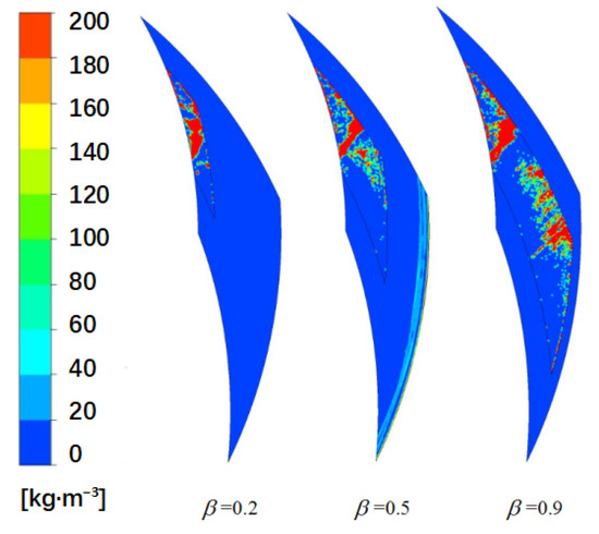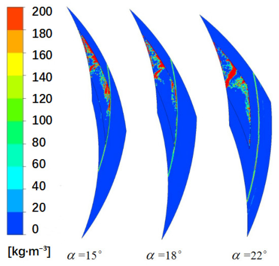 We can perceive from Figure 10 that the particle deposition zone has almost thoroughly covered half of the leeward groove zone that starts from the inner groove root side to the outer groove root side. There is also a circumferential deposition belt on the outer groove root circle. When the spiral angle comes to 18°, apart from the low-pressure zone, the particle deposition zone inside the groove apparently shrinks. However, when it comes to 22°, the particle deposition zone inside the groove contrarily expands. Though the circumferential deposition belt on the outer groove root circle vanquishes, the belt reappears in the dam region. This specifies that a spiral groove that is too small brings about a much too slim and long groove zone, which enhances the capability of the groove to prevent particles from expelling. However, its hydrodynamic capacity is much stronger and the film pressure is higher, so the dam region is difficult to be deposited. However much too large spiral angle makes the groove zone too fat and too short, which enlarges low-pressure zone and weakens the work of shear force. The hydrodynamic effect is relatively weaker in this case, adding that low film pressure, particles find it hard to flee from the groove. Moreover, the deposition easily occurs, of course. Therefore, a proper spiral angle will be convenient for both particle expelling and deposition avoiding.